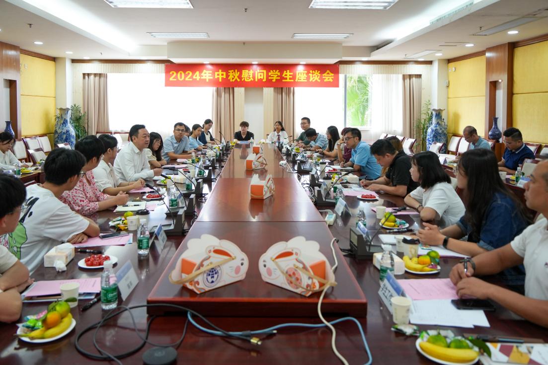 本网讯 9月13日上午,学校在白云山校区和大学城校区同步召开“情系学子,共话成长”2024年中秋慰问学生座谈会。校党委副书记唐锐出席会议,学生工作部、校团委、总务后勤部、基础建设部、现代教育技术中心主要负责人、教师及20余名学生代表参加座谈会。