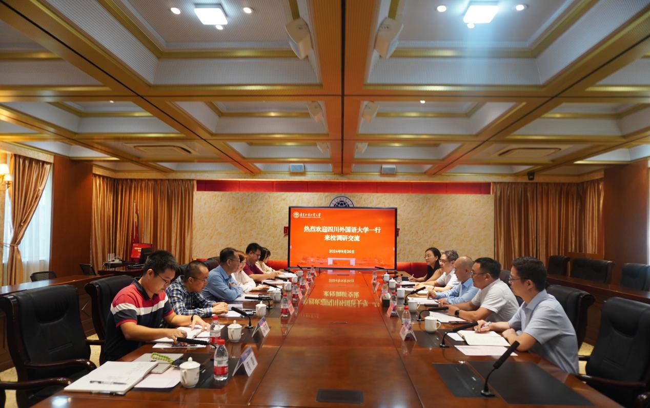 本网讯 近日,四川外国语大学党委常委、副校长王仁强一行来我校调研。我校党委常委、副校长申明浩出席并致辞。学校科研部、财务与资产管理部、现代教育技术中心负责人和相关人员参加座谈。