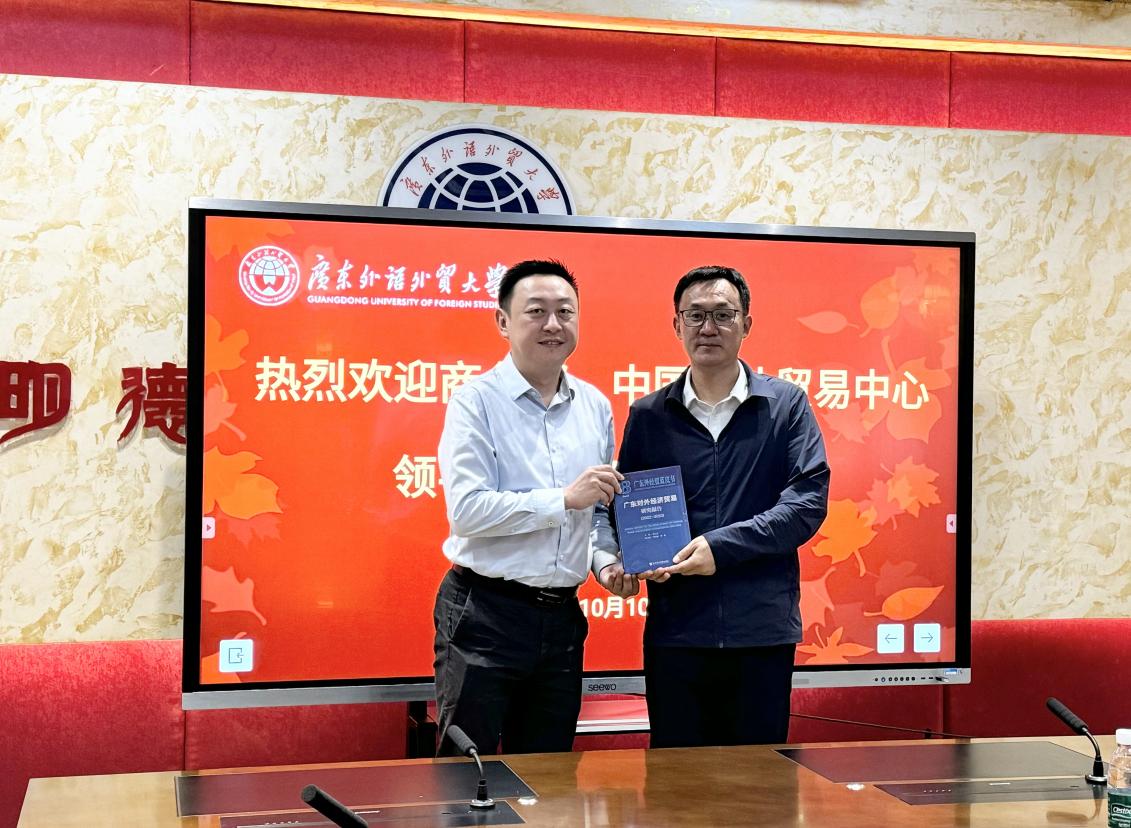 唐锐代表学校对商务部、中国对外贸易中心一行的到访表示欢迎,并简要介绍了我校的发展历程、学科建设、人才培养的情况,重点介绍了我校毕业生高质量就业情况,希望双方能够不断加强合作,我校能为商务部、中国对外贸易中心输送更多优秀人才。中国对外贸易中心副主任苏斌表示商务部与广外渊源深厚,广外是原国家外经贸部(现商务部)直属院校,在商务部、中国对外贸易中心工作的校友人数多、发展前景好,期待之后能够建立更加广泛的合作。商务部人事司干部一处高度肯定我校毕业生的人才培养质量,此次宣讲是商务部首次到广外宣讲,希望今后能够进一步加深合作交流。会后,唐锐向商务部、中国对外贸易中心赠送我校编写的《广东外经贸蓝皮书》。