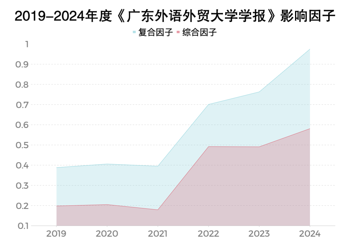 本网讯 根据最新发布的《中国学术期刊影响因子年报(人文社会科学·2024)》,《广东外语外贸大学学报》各项关键指标均实现显著提升。2024年复合影响因子达到0.975,五年内实现251%的增长;综合影响因子增至0.581,增幅达193%。在影响力指数(CI)的学科排名中,学报较2023年上升了11位,跻身全国外国文学专业期刊前三名。