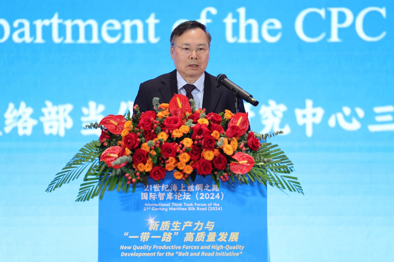 中共中央对外联络部副部长陆慷指出,中国共产党二十届三中全会为发展新质生产力明确了方向,以高科技、高效能、高质量为核心的新质生产力是推动高质量共建“一带一路”的重要抓手。他强调,应抓住机遇,大力发展海洋新质生产力,引领21世纪海上丝绸之路建设。陆慷还呼吁国际社会加强合作,通过数字技术和全球治理平台推动海洋可持续发展,最终实现构建海洋命运共同体的目标。他期待智库专家为海洋新质生产力发展与共建“一带一路”贡献智慧。