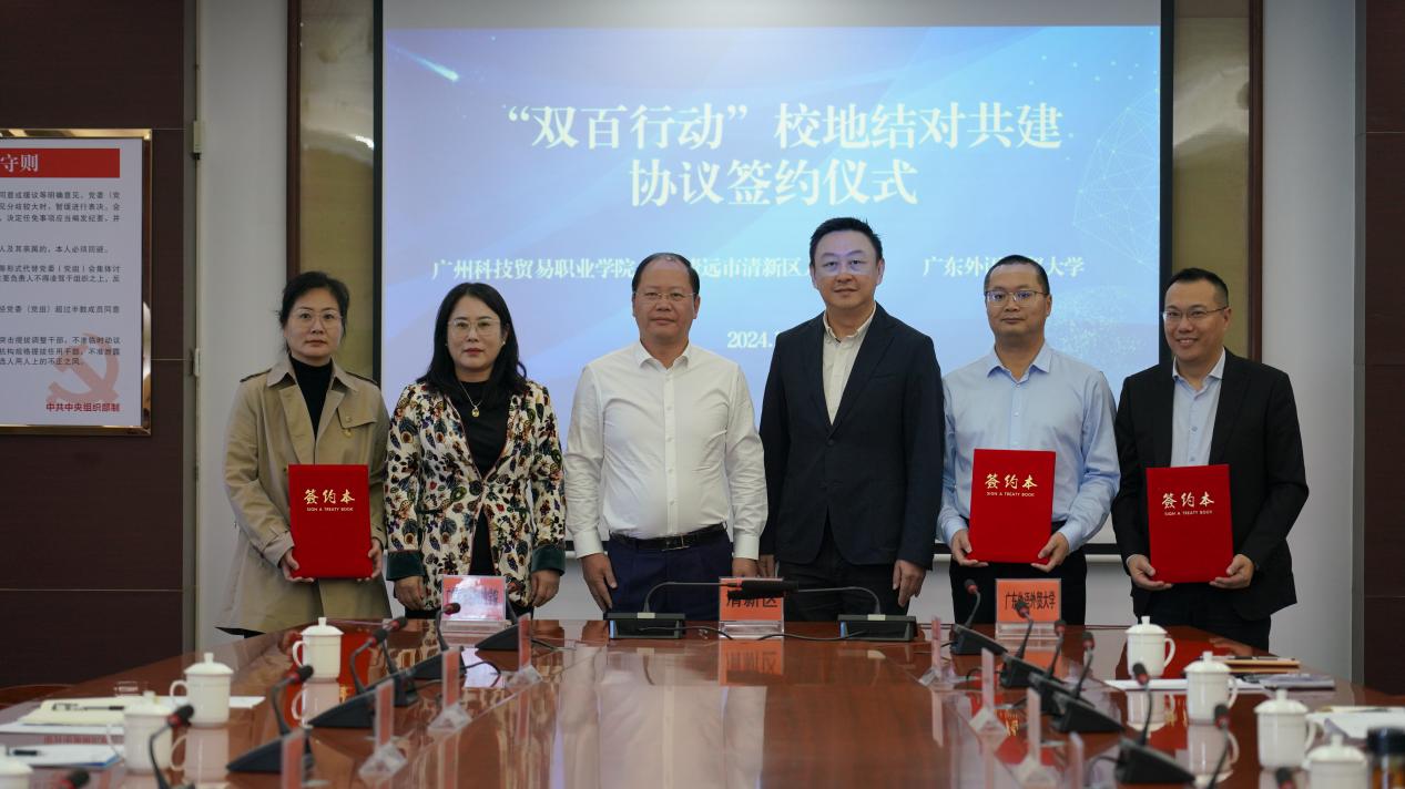 仪式上,与会领导共同见证广东外语外贸大学、广州科技贸易职业学院与清新区人民政府《广东省百校联百县助力“百县千镇万村高质量发展工程”行动》协议的签署。