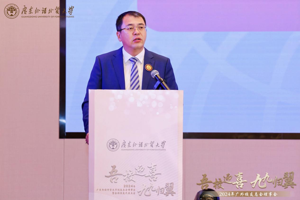 本网讯 11月23日,2024年广东外语外贸大学校友总会理事会暨全球校友代表大会在广州隆重举行。本次活动由广东外语外贸大学校友总会主办、广外物流校友会承办。我校党委书记石佑启,党委副书记、校长闫相斌,副校长刘建达,党委常委、党办校办主任、统战部部长谢伟光,校友事务与合作发展处副处长(主持工作)刘庆丹,以及来自世界各地的160多名校友代表齐聚广州出席本次大会。石佑启为优秀校友工作者颁奖,闫相斌为“广外毅行”获奖队伍颁奖。