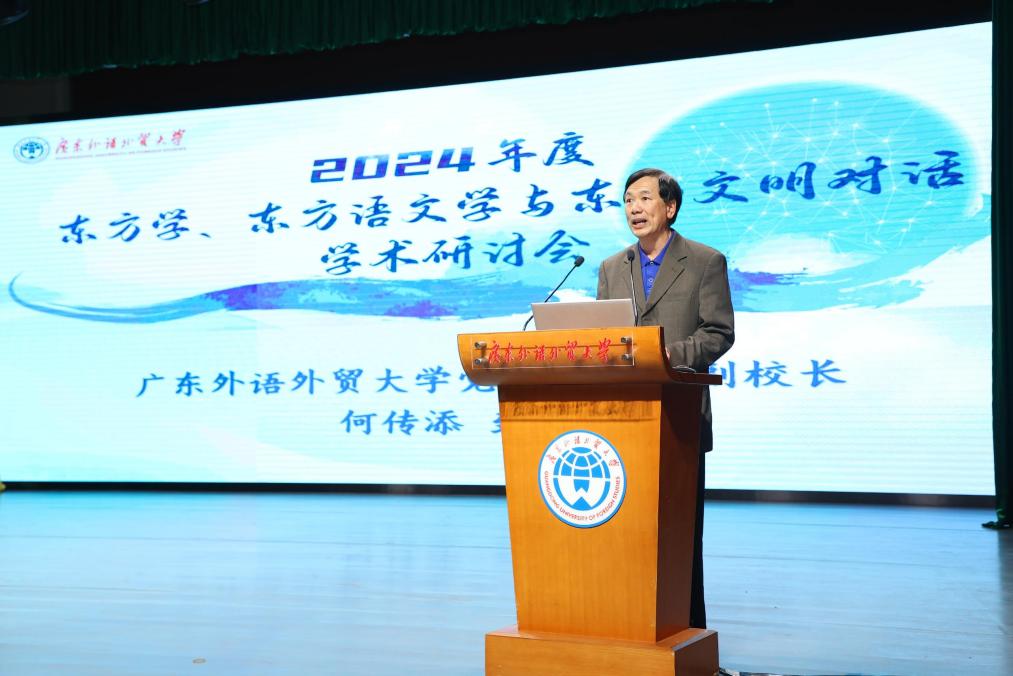 开幕式上,我校副校长何传添在致辞中首先代表学校向与会嘉宾致以最诚挚的欢迎,并指出广外作为语言文学研究的重镇,长期致力于推动东方学研究的学科建设和学术发展。本次研讨会将聚焦区域国别研究、东西文明对话等前沿议题,为学术界提供思想碰撞的契机,为学科建设注入强劲的新动力。