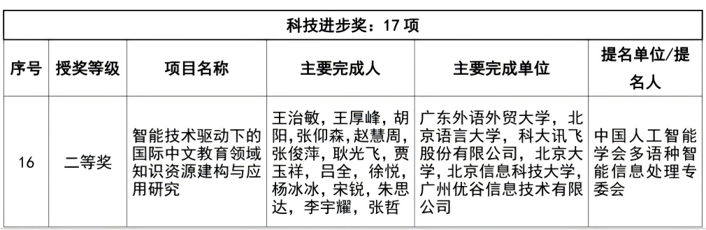本网讯 近日,中国人工智能学会发布了《2024年度吴文俊人工智能科学技术奖奖励公告》,我校王治敏教授联合兄弟院校和科技公司,领衔申报的“智能技术驱动下的国际中文教育领域知识资源建构与应用研究”项目荣获吴文俊人工智能科技进步奖二等奖。这一项目是国际中文教育领域首个获得该奖项的成果,标志着人工智能与国际中文教育的深度融合进入新阶段,同时也实现了广外在该国家级人工智能科技奖项上的历史性突破。