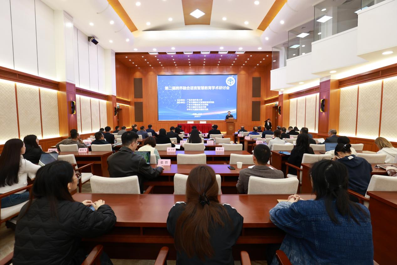 本网讯 3月9日,第二届跨界融合语言智慧教育研究研讨会在广外白云山校区行政楼国际会议厅召开。广外党委书记石佑启教授、教育部中外语言交流合作中心资深项目主任王峰、国际中文教育基金会副理事长(原北京语言大学校长)刘利教授在开幕式上致辞。香港科技大学(广州)党委书记屈哨兵教授等来自语言学及应用语言学、国际中文教育、计算语言学、人工智能等研究领域及产业界的20余位专家作大会报告。