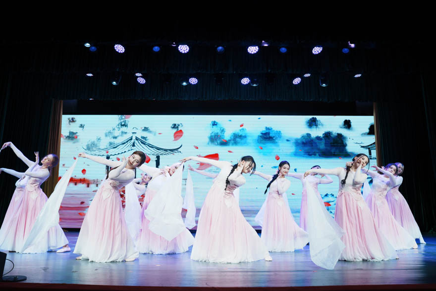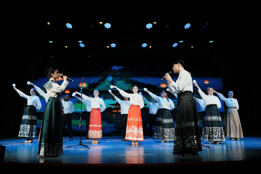 文艺演出精彩不断,令人目不暇接。留学生院舞队带来中国舞《恋梦清扬》作为开场节目,舞者们以婀娜的身姿演绎东方韵味,轻盈的动作中流淌着中国古典舞的含蓄与典雅;民族乐器与现代乐器交织而成的乐队表演《爱人错过》则用音乐点燃全场,马头琴悠扬、电子琴动感,鼓点激昂,主唱一声声高唱,引发台下热烈欢呼。