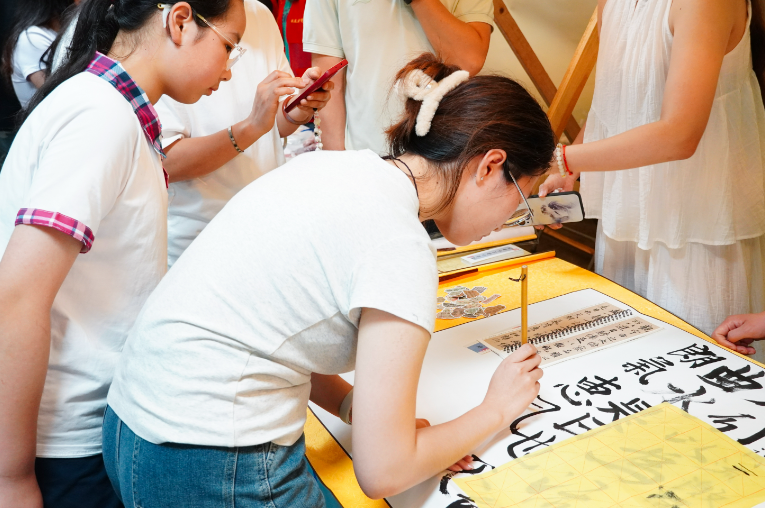 在活动现场,传统文化体验环节丰富多样、亮点频出。广外大社区、陈田二社区设置的“粽情香囊”端午刺绣和“漆韵风华”非遗漂漆工艺体验摊位吸引众多师生驻足,大家在飞针走线和漆彩晕染中沉浸式感受中华传统手工艺的独特魅力。书画协会带来的“笔墨横姿”书法互动区,结合书写体验与“猜甲骨文”等趣味游戏,增强了活动的互动性与趣味性。最受欢迎的“华韵流赏”服饰体验区,则通过汉服、旗袍等传统服饰试穿,让留学生们零距离感知中国服饰文化的独特风采。四个文化摊位交相辉映,共同营造了浓厚的中华文化氛围。