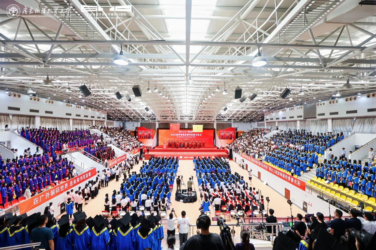 本网讯 伴随着别开生面的毕业快闪,全体毕业生合唱多语种生日快乐歌,共同祝福母校60周年生日快乐,瞬间点燃现场氛围,这是广外2025届毕业典礼开始前的精彩瞬间,气氛温馨而热烈。6月27日,2025届毕业典礼暨首场学位授予仪式在白云山校区举行。根据安排,大学城校区2025届毕业生学位授予仪式将于6月28日下午举行。
