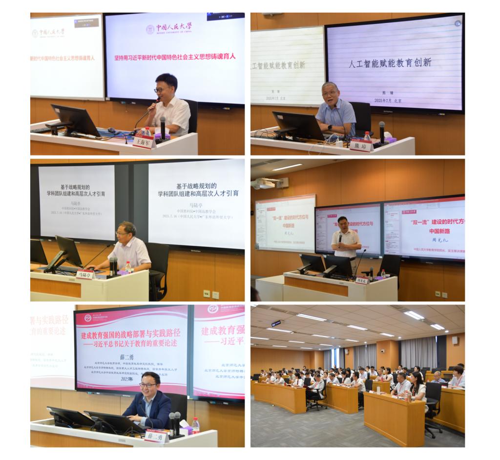 在专题授课中,中国人民大学中共党史党建学院教授王海军以“坚持用习近平新时代中国特色社会主义思想铸魂育人”为题,阐释党的创新理论对高等教育的指导意义;对外经济贸易大学信息学院院长、北京航空航天大学教授熊璋讲授人工智能赋能教育创新,探讨科技赋能教育现代化的路径;中国教育科学研究院研究员马陆亭解析基于战略规划的学科团队组建与高层次人才引育,提供学科建设方法论;中国人民大学教育学院院长、党委副书记周光礼分享人大“双一流”建设的探索路径与实践经验,为学校改革发展提供对标蓝图;北京师范大学京师特聘教授薛二勇深度解读建成教育强国的战略部署与实践路径——习近平总书记关于教育的重要论述,系统阐释了教育强国建设的顶层设计逻辑、阶段性任务及推进举措。