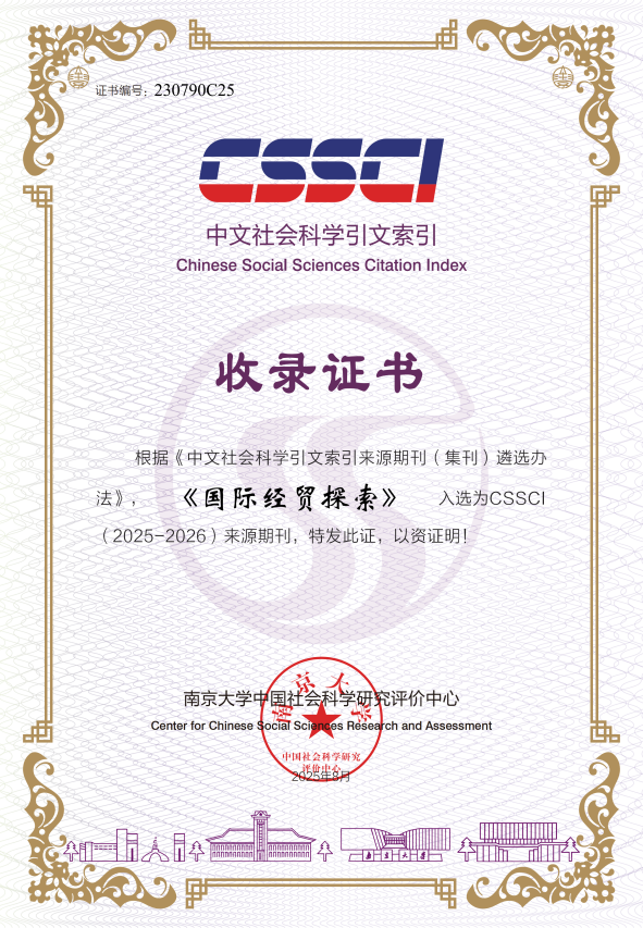 《国际经贸探索》创刊于1985年,是由广东外语外贸大学主办的贸易经济类核心学术期刊、月刊;本刊主要刊发国际贸易、国际金融与投资、国际经贸规制和全球经济治理等领域最新学术研究成果;本刊先后荣膺“全国高校三十佳社科期刊”(2010)、“全国高校精品社科期刊”(2014)、“全国高校社科名刊”(2019)、“全国高校权威社科期刊”等荣誉称号,历年均入选南京大学中文社会科学引文索引(CSSCI)来源期刊。