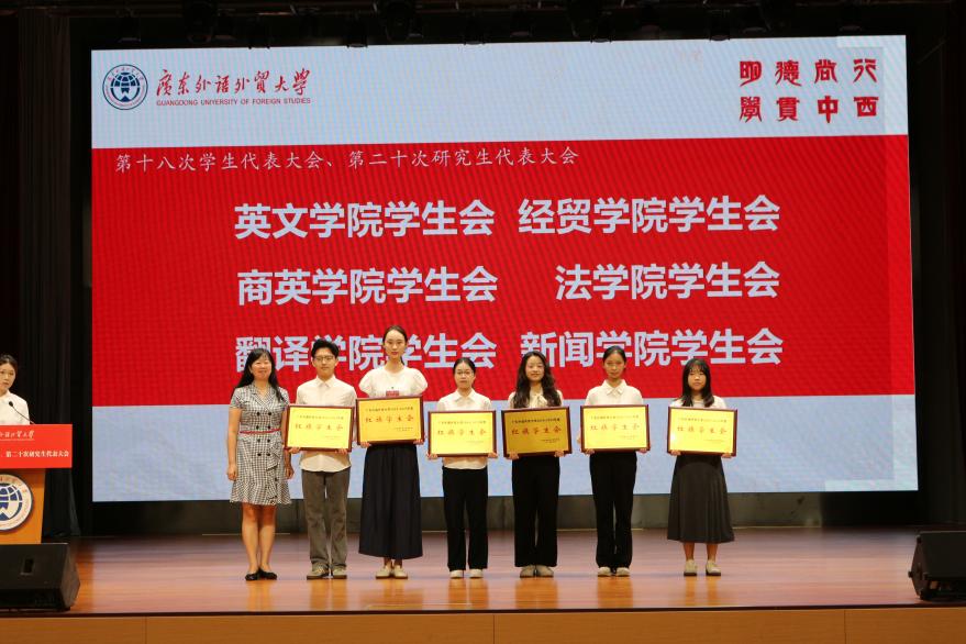在2024-2025学年红旗学生会、“我为同学做实事”优秀项目颁奖仪式,英文学院、经贸学院、商英学院、法学院、翻译学院、新闻学院学生会获评2024-2025学年红旗学生会,会计学院、西语学院、中文学院、信息学院、艺术学院、数统学院等6个项目获评“我为同学做实事”优秀项目。获奖师生代表西语学院团委书记冯迪南、法学院学生会执行主席高楚纬作分享发言。