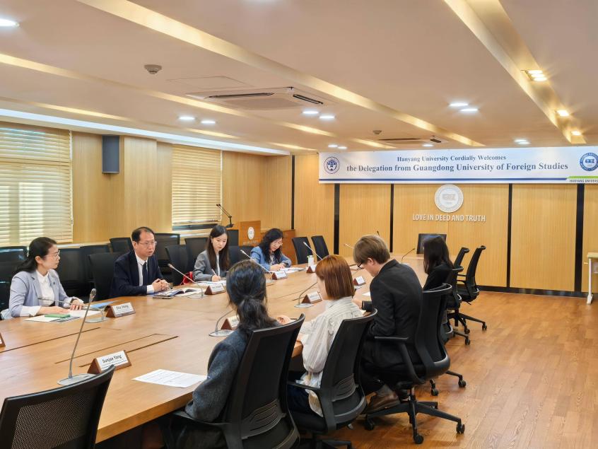 此外,代表团还走访了韩国汉阳大学,并与该校国际交流处处长李在基展开会谈。申明浩向对方介绍了粤港澳大湾区发展的区位优势,我校学科发展情况和韩语专业建设情况以及教育部亚洲大学计划,并希望与汉阳大学加强教师交流、学生交流交换项目等合作。李在基表示,两校在学科和专业上有很多类似之处,期待派汉阳大学学生来广外交流,并加强两校教师间学术交流与合作研究。