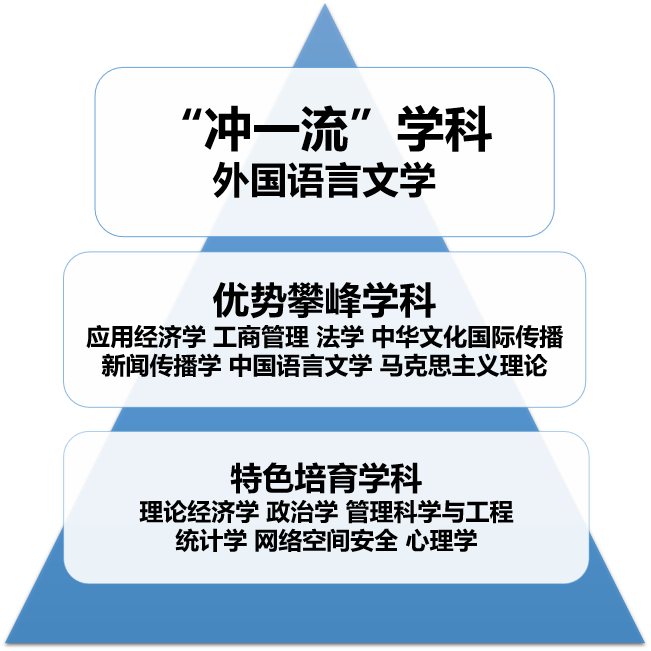 2018年,广外获批新增应用经济学一级学科博士点;2021年,获批新增法学一级学科博士点,并实现硕士点覆盖全校所有培养单位,中华文化国际传播学科被增列为高水平大学重点建设学科,学校入选广东省“冲补强”提升计划高水平大学重点建设高校,5个学科入选高水平大学重点建设学科。