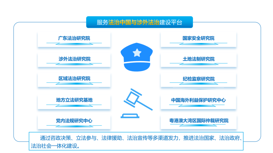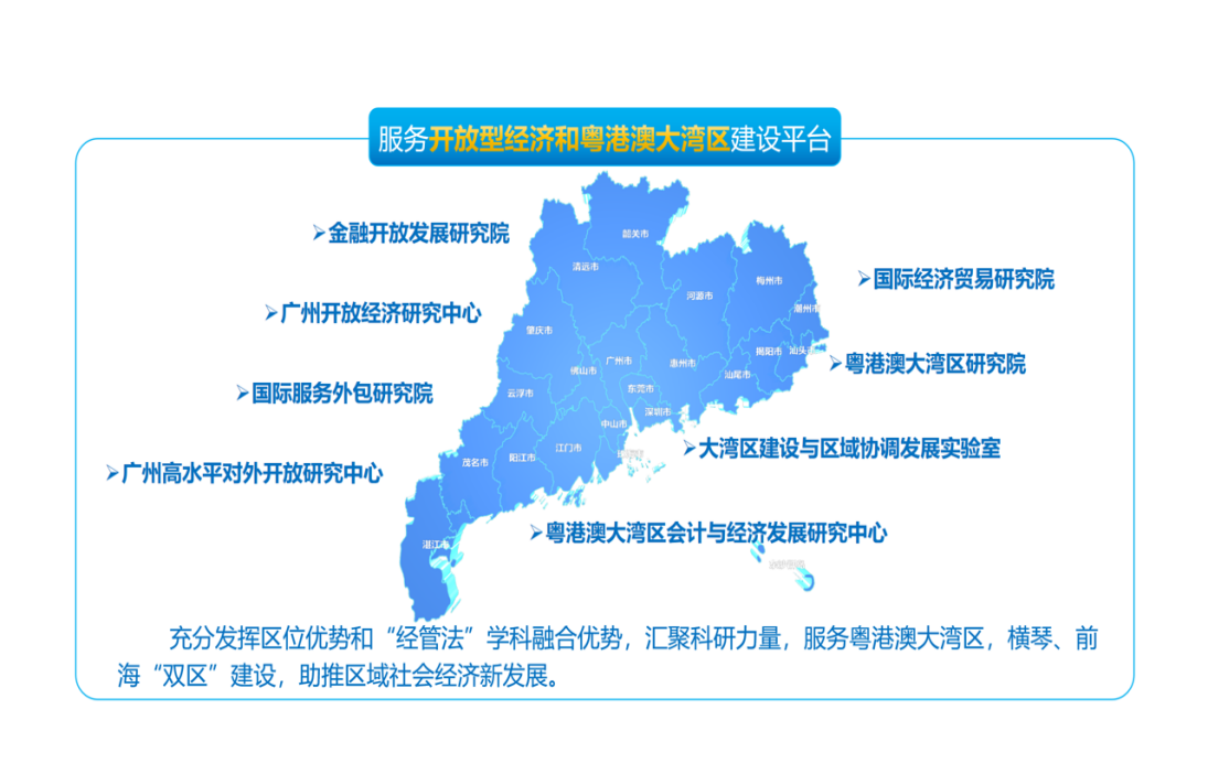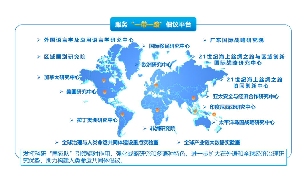截至2025年,学校建成“国家—省—市—校”四级联动的科研平台体系,覆盖四大战略领域。已建成国家级科研平台3个、省级科研平台18个、市级科研平台4个,并构建起服务“一带一路”倡议、开放型经济与粤港澳大湾区建设、法治中国建设、国际传播等四大科研平台体系。外国语言学及应用语言学研究中心(该学科唯一国家级基地)在2022年教育部评估中位列全国基础研究型基地第7名,21世纪海上丝绸之路与区域创新国际战略研究中心通过教育部考核,多项咨询报告获省部级采纳或批示。