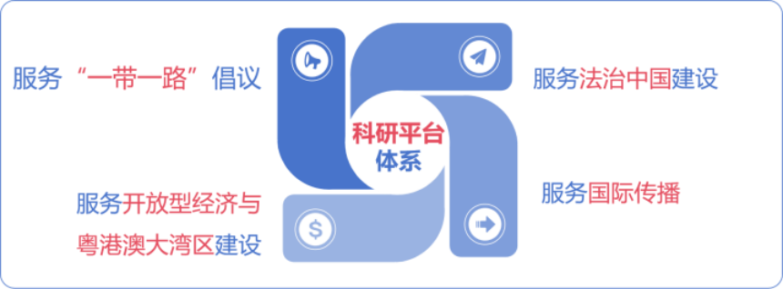广东法治研究院(涉外法治研究院)、区域法治研究院、地方立法研究中心、党内法规研究中心、土地法制研究院等高端智库参与《中华人民共和国民法典》等近60部法律法规的起草论证,多项决策咨询报告获中央与省部级领导批示采纳。承办中国法学会行政法学研究会年会、中国刑事诉讼法学研究会年会、首届中国大洋洲法治论坛、全球卫生法治论坛等全国性、国际性学术论坛。与教育部政策法规司、省教育厅共建华南地区唯一一所青少年法治教育中心。