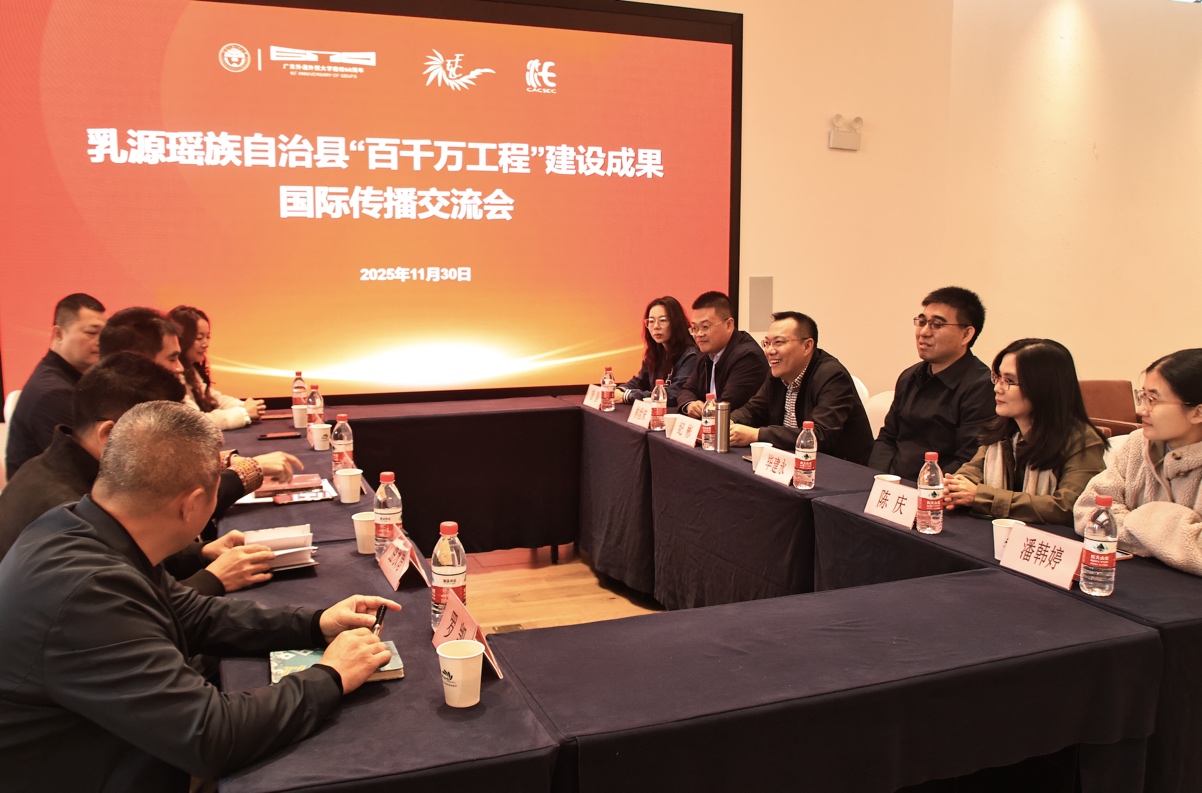 大会期间,会议主办方还特别组织召开乳源瑶族自治县“百千万工程”建设成果国际传播交流会,翻译批评委员会的专家代表与乳源政府及相关部门围绕瑶族文化的国际传播、文化资源转化、乡村振兴中的语言服务等议题展开深度交流。会议由广外英文学院党委书记纪彬主持,译国译民董事长、广外在读博士生林世宋、翻译批评专委会理事陈庆副教授、翻译批评专委会理事潘韩婷副教授、广外-省委党校驻乳源“双百行动”工作队队长毕建勇、广外教务部副部长唐静、乳源瑶族自治县副县长邓晓羚、宣传部副部长盘永周、统战部常务副部长兰贤、教育局副局长卓蓉珍、文广旅体局副局长罗凯出席会议。现场交流氛围热烈,观点相互激荡,灵感频频迸发,与会各方在跨领域的思维碰撞中进一步拓宽了视野、凝聚了共识。参会代表结合自身研究,同步将学术议题延伸至文化国际传播与乡村振兴的现实需求,提出“智能体赋能国际传播”的构想,建议依托广东乡村振兴教学智能体的建设经验,通过技术赋能的教学训练,提升学生在乡村振兴主题下的国际传播能力与跨文化叙事素养,为中国乡村振兴实践的国际话语建构培育专业化人才。此外,参会代表还从翻译教育、跨文化传播等角度,倡议将高校资源与地方需求深度联动,形成“科研—教学—地方实践”互促机制,为乳源的国际传播体系建设提供长期智力支持。这是专委会发挥学术组织优势、支持欠发达地区文化建设的具体行动,也标志着翻译批评研究从学术论坛进一步走向社会服务与文化实际需求。同时,这也是作为承办方的广外英文学院联合专委会发挥国际化办学特色,助力学校“双百行动”走深走实的有益实践,为高校服务地方发展开拓了新的路径。