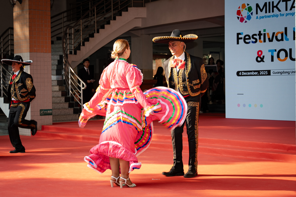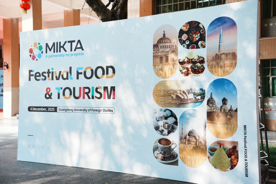 本网讯 冬日广外,暖意融融。12月4日下午,由墨西哥、印度尼西亚、韩国、土耳其、澳大利亚五国驻广州总领事馆联合主办、我校承办的第五届MIKTA美食旅游节在白云山校区主校道隆重举行。本次活动以“美食为媒,文化共鉴”为主题,通过美食品鉴、民俗展演、互动体验等多元形式,生动呈现MIKTA合作框架下的文化多样性,为中国与五国青年深化交流、推动多边主义与文明互鉴搭建起一座桥梁。韩国驻广州总领事姜相旭、墨西哥驻广州总领事Daniel Dominguez、印度尼西亚驻广州总领事Ben Perkasa Drajat、土耳其驻广州总领事Adnan Hayal、澳大利亚驻广州副领事林阳、省外办代表张诗、葛瑶及我校相关部处、学院的领导和代表出席了本次活动。广外副校长申明浩作开幕致辞。