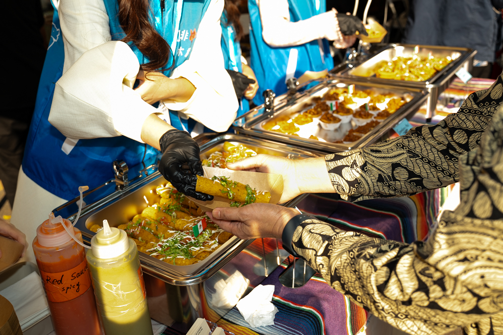 在印度尼西亚摊位前,炭香扑鼻的沙爹鸡肉串令人食指大动,什锦油炸小吃金黄酥脆、咸香适口,香料十足的爪哇炒饭与椰香四溢的斑斓糕为味蕾“加码”,洋溢着热带群岛的独特气息。