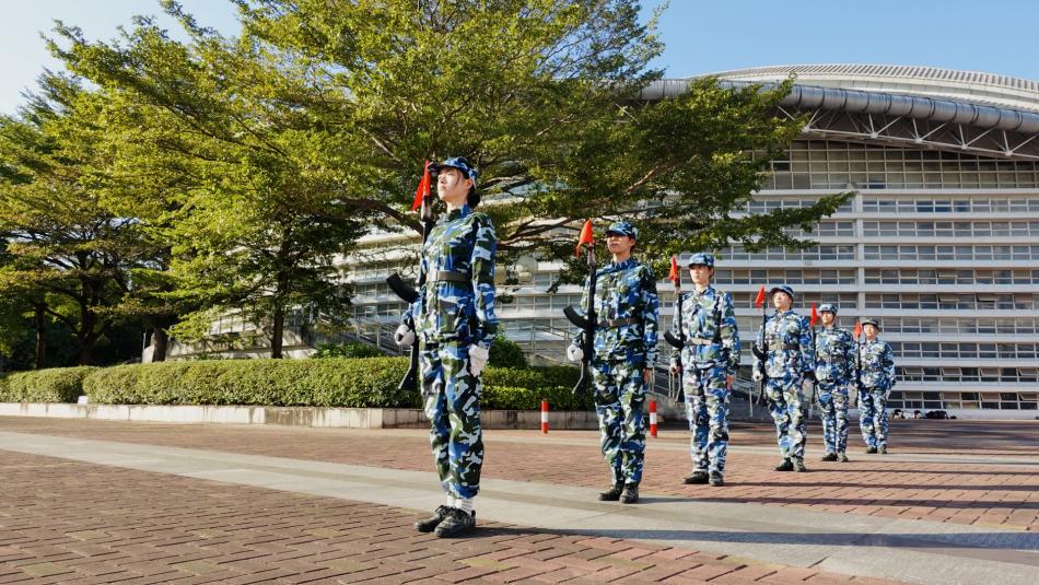树木不甘于固有形态,主动探求阳光更充沛的伸展空间,同学们也纷纷探出“新枝”,从统一的基础队列“抽枝”,尝试各具特色的专项技能。“因为高中已经学过分列式了,想尝试点新东西。”数统学院的陈同学握着警棍,兴致勃勃地分享道。“动作比较多,要记”,但“1234”的口令节奏分明,整齐挥棍的韵律深入人心,让这个过程变得“更灵活”“更轻松”。值得一提的是,今年的警棍方阵在六个基础动作之上,新增了四节进阶动作,提升了训练的挑战性。面对即将到来的军训汇演,陈同学坦言心中交织着兴奋与紧张。她和警棍方阵的同学都力图把每一次练习都当作正式演出,反复打磨每个转身、每次挥击,只为在汇演当日,当“迷彩飞扬,警棍锋芒;百炼成钢,斗志昂扬”的铿锵口号响起时,能让整个方阵的动作都展露出最饱满、最有力的青春锋芒。
