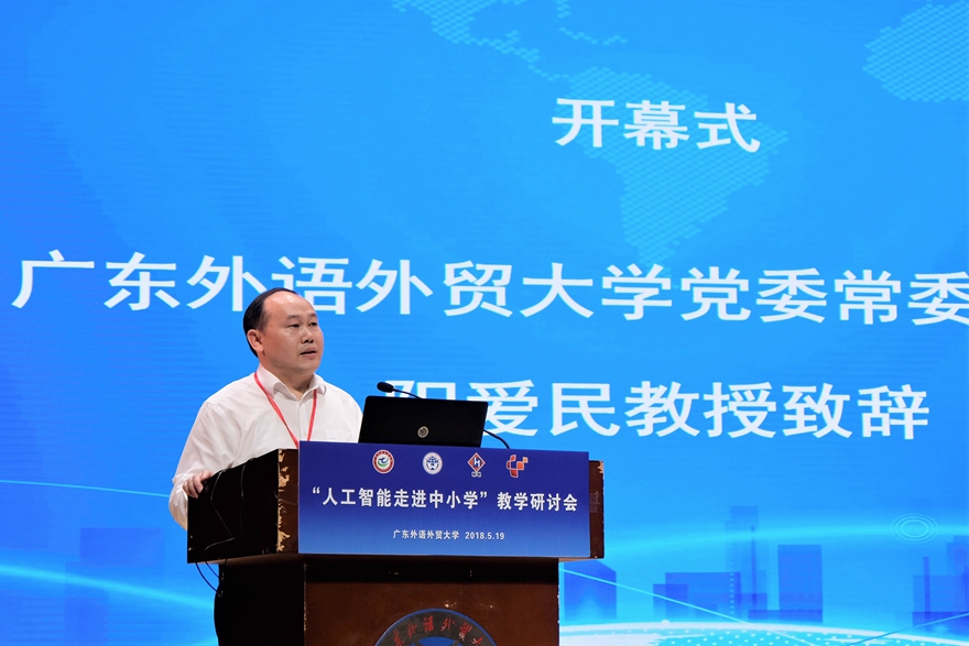 我校副校长阳爱民在致辞中介绍,广外作为一所国际化特色鲜明的省属重点大学的基本情况,除了具有外语学科的优势,这几年在人工智能、网络空间安全等领域也取得了长足的发展。此外,在基础教育领域,广外也积极利用自身优势,走出了一条集团化的基础教育发展之路,建成了广东省内首屈一指的基础教育集团化办学品牌。他指出近年信息技术与教育的结合已成为不可阻挡的潮流与趋势。也是国家对教育发展的要求。以习近平新时代中国特色社会主义思想和党的十九大精神为指导,推进教育教育信息化是每个教育者应该落实的重要工作。