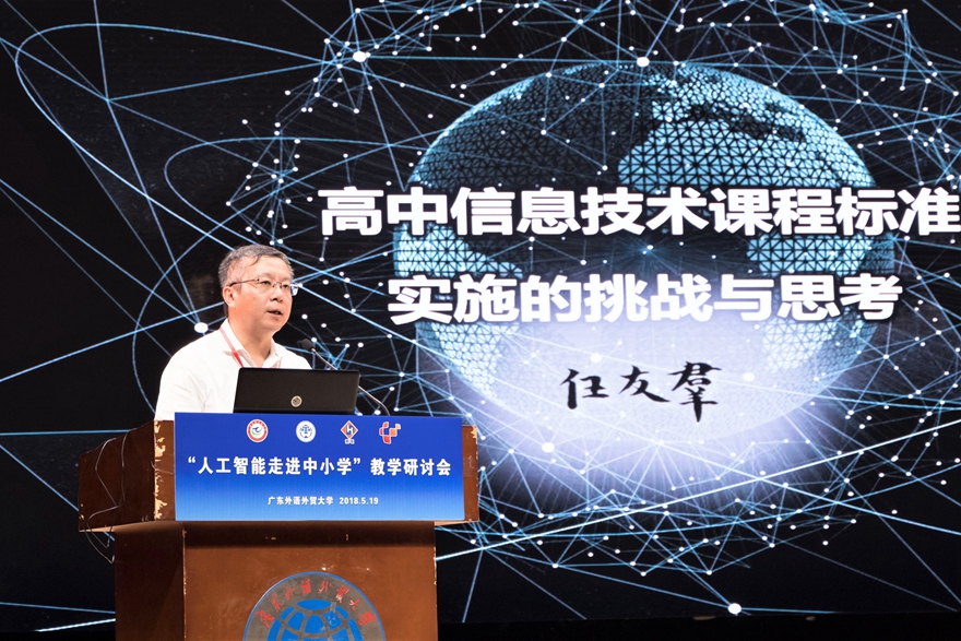 本网讯 为探讨基础教育人工智能课程的教学,5月19日,“人工智能走进中小学”教学研讨会在广东外语外贸大学云山会堂召开。研讨会为期半天,进行课标解读、专家报告、名校经验介绍、教学实例演示等环节。会议由广东省教育研究院主办,我校信息科学与技术学院/网络空间安全学院承办,广东恒电信息科技股份有限公司、我校教育集团、广东音像教材出版社协办。