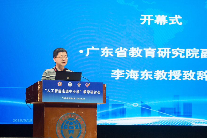 广东省教育研究院副院长李海东表示,广东很早就在人工智能教育上开展了积极的探索,在2004年就正式出版了经教育部初审通过的高中信息技术教材《人工智能初步》,在全国高中学校使用,是全国第一本经过国家审定的人工智能高中教材;本次研讨会在全国也是第一次召开,广东省在新时代高度重视人工智能全面走进中小学教学的重大机遇和多方面挑战。他希望以本次研讨会为契机,使广东各级教研机构、中小学认清教育改革发展形势,更加充分学习贯彻落实基础教育新课程方案和新课程标准,以更大的决心、更大的力气共同推动人工智能走进中小学校,积极发展人工智能教育,为奋力实现“四个走在全国前列”,推动习近平新时代中国特色社会主义思想在南粤大地落地生根、结出丰硕成果,为建设教育强省、加快教育现代化做出新的更大的贡献。