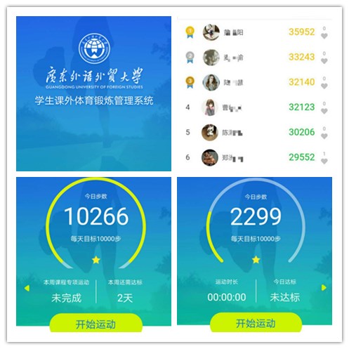 新学期,我校校园里,同学们见面最常问的问题是你今天一万步了吗?”这是为什么呢?原来,广外体育课课外锻炼迎来了新的规定:学生每天需要步数达10000步以上,或当天在装有蓝牙发射器的体育场馆锻炼40分钟以上;每周锻炼需达标五次,且至少有一次在体育场馆练习专项内容不少于40分钟。未完成者扣除体育成绩的10%。学校体育部于4月2日正式启用微信小程序“课外锻炼管理系统”记录学生的锻炼情况,在程序中可以实行运动签到、运动数据记录与评分等服务。值得一提的是,该系统是国内首个针对教育部有关大学生课外体育锻炼要求指标量身定做的应用程式。