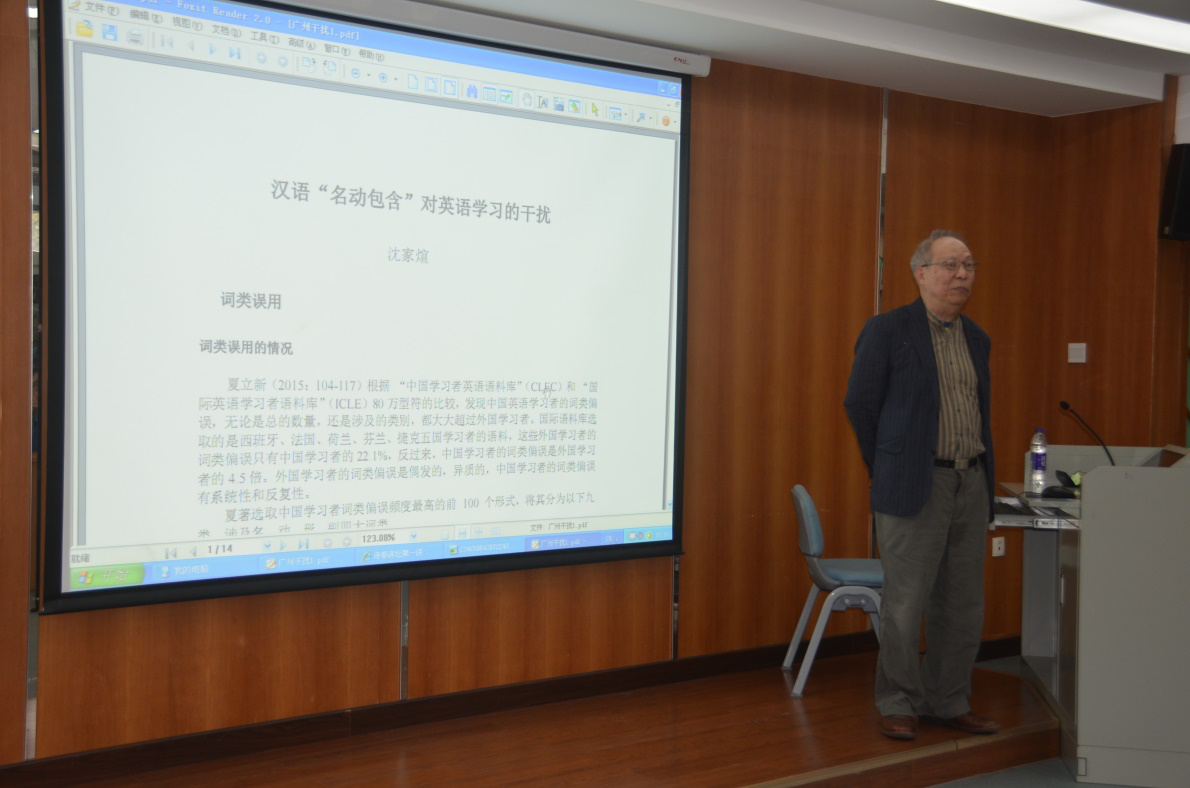 本网讯 4月20日,为传承和弘扬桂诗春先生“以不息为体,以日新为道”的为人治学精神,我校近期启动“诗春讲坛”,首场讲座在我校白云山校区第九教学楼306教室举行,著名语言学家、中国社会科学院语言研究所前所长沈家煊作了题为“汉语‘名动包含’对英语学习的干扰”的讲座。讲座由我校副校长、外国语言学及应用语言学研究中心主任刘建达主持。我校相关语言学院师生以及研究机构研究员聆听讲座。