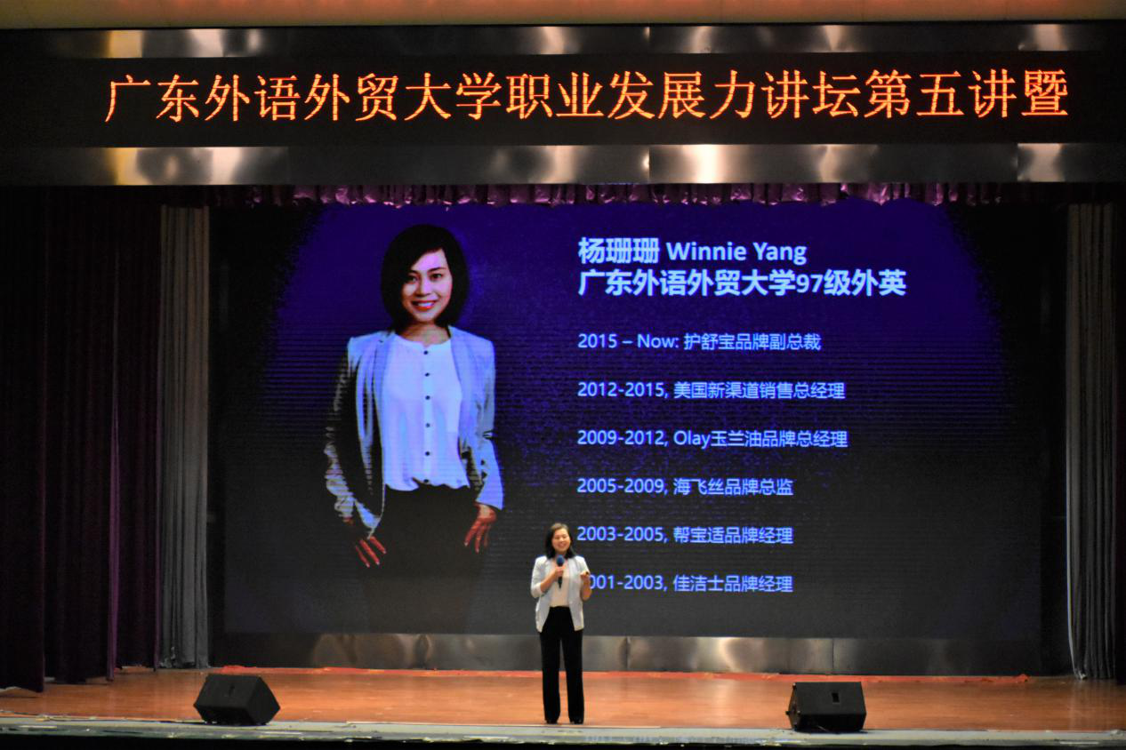 本网讯 4月12日晚,我校职业发展力讲坛第五讲暨宝洁大学公开课在南校区B8学术报告厅举行。宝洁大中华区女性护理品类副总裁杨姗姗作题为“电商新纪元”主题讲座,就电商发展趋势、老牌子如何融入电商以及如何赢在新零售三个方面进行分享。
