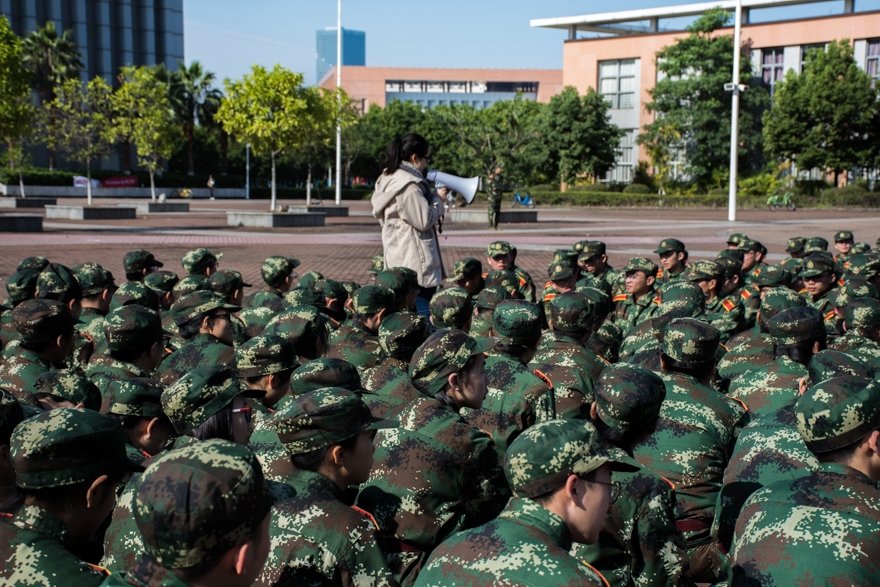 在学生们整齐划一的步伐、教官们刚强有力的指令声之外,操场上训练的每块方阵间总是有那么三两个与军训学生你年纪相仿的“闲人”穿插其中。他们或是举着相机、手机仔细捕捉着眼前受训者的一举一动,或是在休息时默默走到他们之间加油打气。不用多想,他们就是大一学生们的师兄师姐。