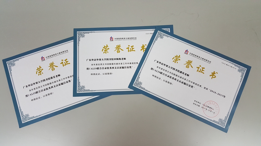 本网讯 作为中国高等教育文献保障系统((China Academic Library and Information System,简称CALIS))成员馆,我校图书馆一直以来积极参与CALIS联合目录项目建设,重视编目人才培养,着力打造突出的编目团队。近日,CALIS联机合作编目中心对2016-2017年度CALIS联合目录各项工作指标进行了统计,并组织专家对数据质量进行评估,我馆在本次评优工作中荣获 “2016-2017年度CALIS联合目录馆藏数据建设先进单位奖”、“2016-2017年度CALIS联合目录小语种数据库建设先进单位奖”和“2016-2017年度CALIS联合目录西文数据库建设先进单位奖”三个奖项,田梅梅、潘涛和蒋芬在西文书目数据共享共建工作中表现优秀,获得年度 “CALIS联合目录优秀西文认证编目员奖”。