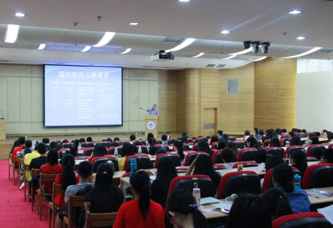 宋允孚结合自己过去几十年的国内外外事工作经历,从为什么到国际组织(Why)、什么是国际职员(分类、要求、福利待遇)(What)、能力建设与竞聘攻略(How)等三个方面分享了在国际组织实习、求职、任职的经验。他勉励同学们树立家国情怀,将个人前途和国家命运紧密联系起来,“志存高远、脚踏实地”,努力学好外语以及专业知识,为壮大我国国际职员队伍贡献力量。