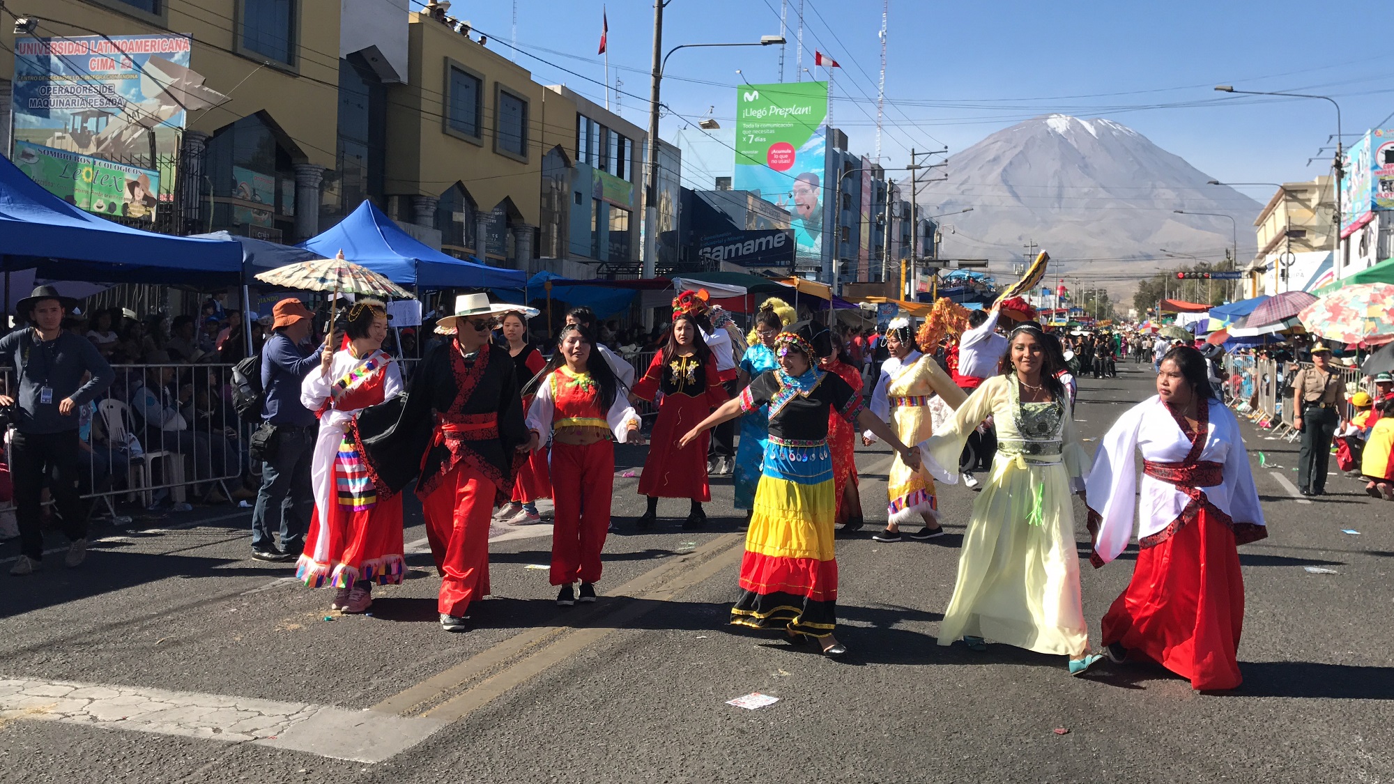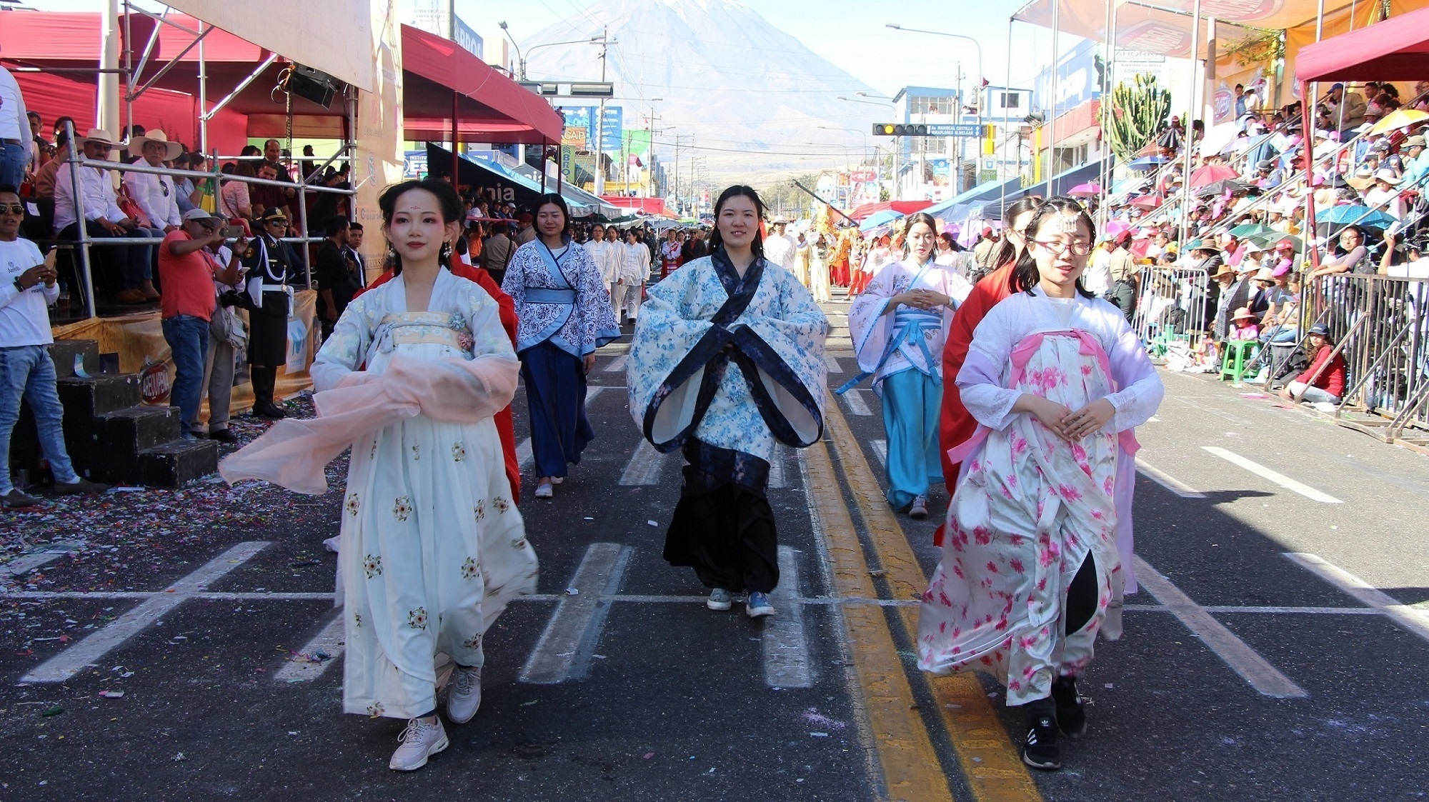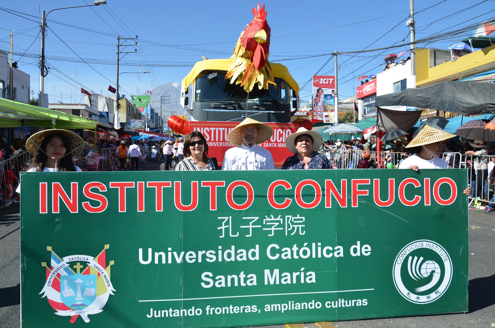 本网讯 8月15日,为庆祝建城477周年,秘鲁南部城市阿雷基帕市举行一年一度盛大的花车巡游。成百上千辆花车沿着主要街道巡游,人们载歌载舞,整座城市热闹非凡,沉浸在一片狂欢的海洋中。秘鲁圣玛丽亚天主教大学孔子学院大型“金鸡”花车,舞龙、舞狮、中国古典舞蹈、太极功夫扇、中华民族服装秀等表演成为节日亮点,赢得数万观众的喝彩。