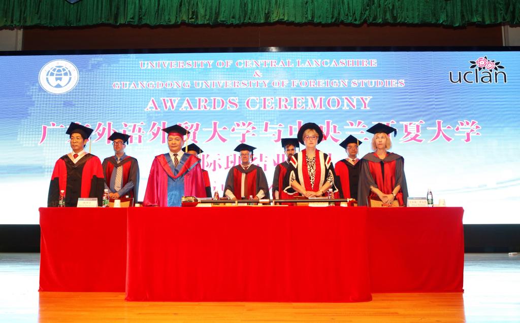 本网讯 6月22日下午,我校与英国中央兰开夏大学(以下简称兰开夏)国际班结业典礼在北校区六教报告厅举行。兰开夏规划与国际战略高级副校长Liz Bromley,英国驻穗代总领事Karen Maddocks,我校副校长陈林汉、国际学院党总支书记钟罗军、国际学院副院长(主持工作)魏辉良,以及国际合作与交流处等单位负责人、两校教师代表和96位就读兰开夏国际项目的学生参加仪式。
