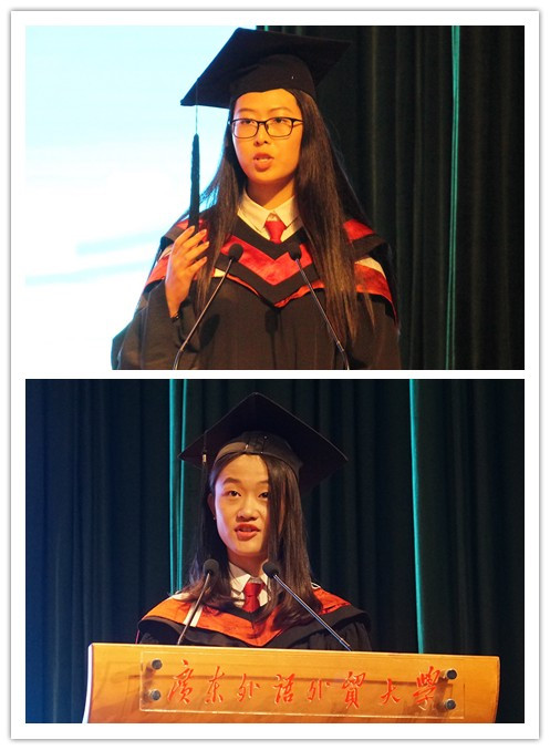 学生代表冯熙文表示国际学院让她结识了不同国籍的朋友,丰富了见识,开拓了眼界。她同时代表所有国际学院的结业生向学校的领导、老师以及一直在身边默默支持自己的朋友、家人表达了诚挚的感谢。她回忆了将近考试的时候,每个在图书馆奋战的日夜,并勉励同学们奋发向上,希望大家能在国外获得更大的成就。