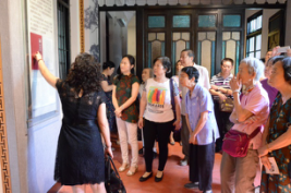 在中央党部旧址讲解员义工三组组长简小庆(支部副主委)、讲解员义工孙章季两位老师的分工介绍下,党员一丝不苟,认真观看展示,互有交流;高碧莲老师对其中展示老前辈、原致公党中央副主席、广东省委会主委伍觉天的办公用品及图片、文字等说明激动不已,手扶拐杖口述当年她曾经每天到此与伍老一起办公的情景,让后来人更加了解对中国致公党早期的党史、尤其华南总支和后来致公党广东省委会的发展历史。