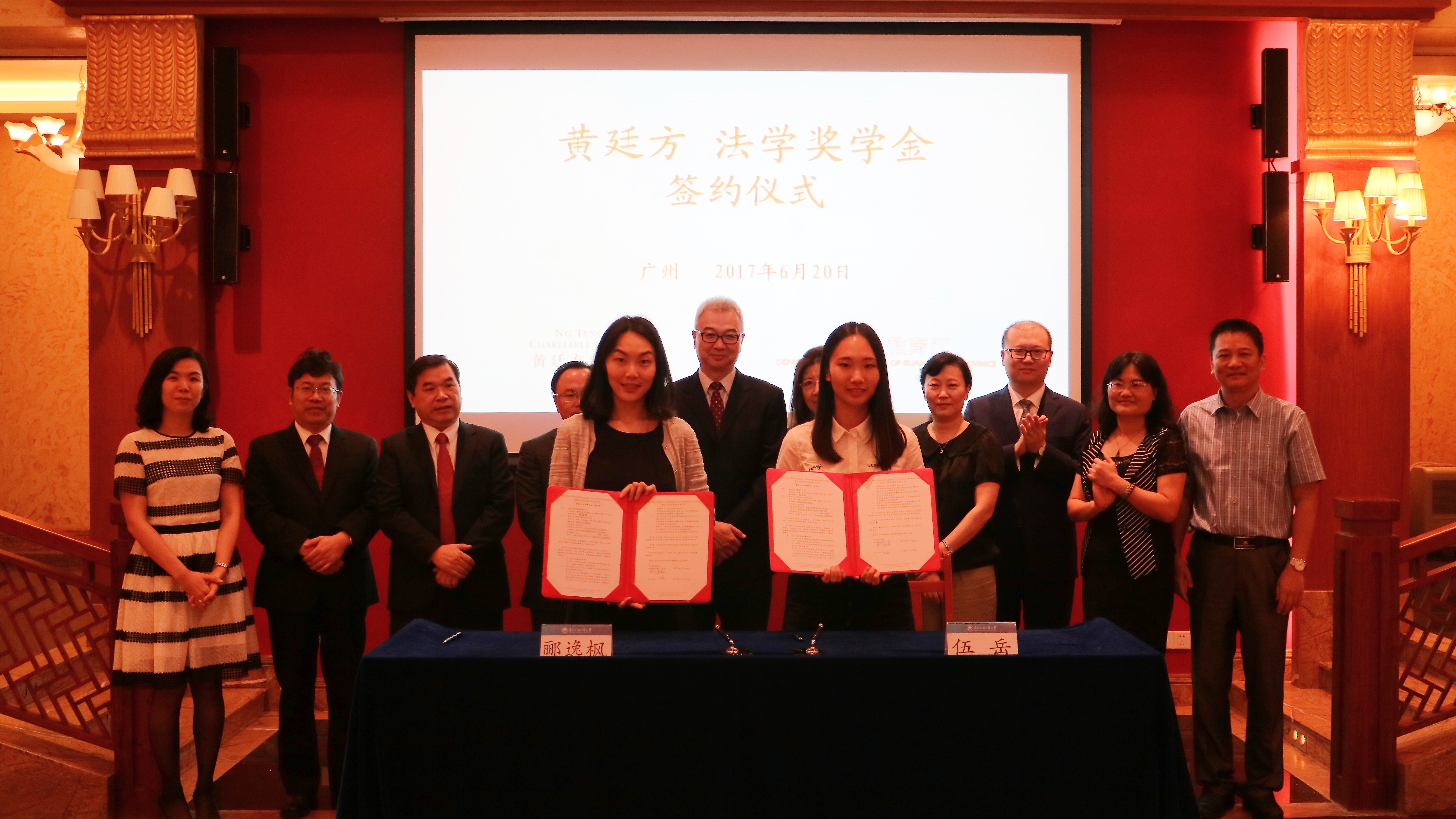 本网讯 6月20日,2017年“黄廷方法学奖学金”签约仪式在我校北校区行政楼贵宾厅举行。该奖学金将授予包括我校在内的四所广东高校的五名法学专业学生,支持他们赴英国知名大学攻读法学硕士专业。“黄廷方慈善基金”代表黄若红,全国人大港澳基本法委员会研究室巡视员潘小达,中央驻港联络办法律部副部长、巡视员刘春华,广东省教育厅副厅长王创,广东省司法厅调研员李红以及来自我校和中山大学、华南理工大学、暨南大学、华南师范大学、广东财经大学、深圳大学等机构的代表出席仪式。