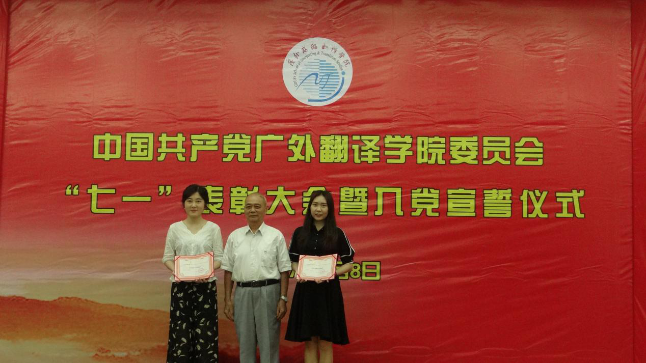 本网讯 6月8日下午,翻译学院举行“七一”表彰大会暨入党宣誓仪式。面对鲜红的党旗,28名预备党员在教师党员、学生入党介绍人的带领下庄严宣誓,一批先进基层党组织和优秀个人得到表彰。校关心下一代工作委员会主任冯益谦、校党建组织员李海丽和翻译学院教工党员、学生党员、入党积极分子参加活动。翻译学院党委书记刘志军主持仪式。