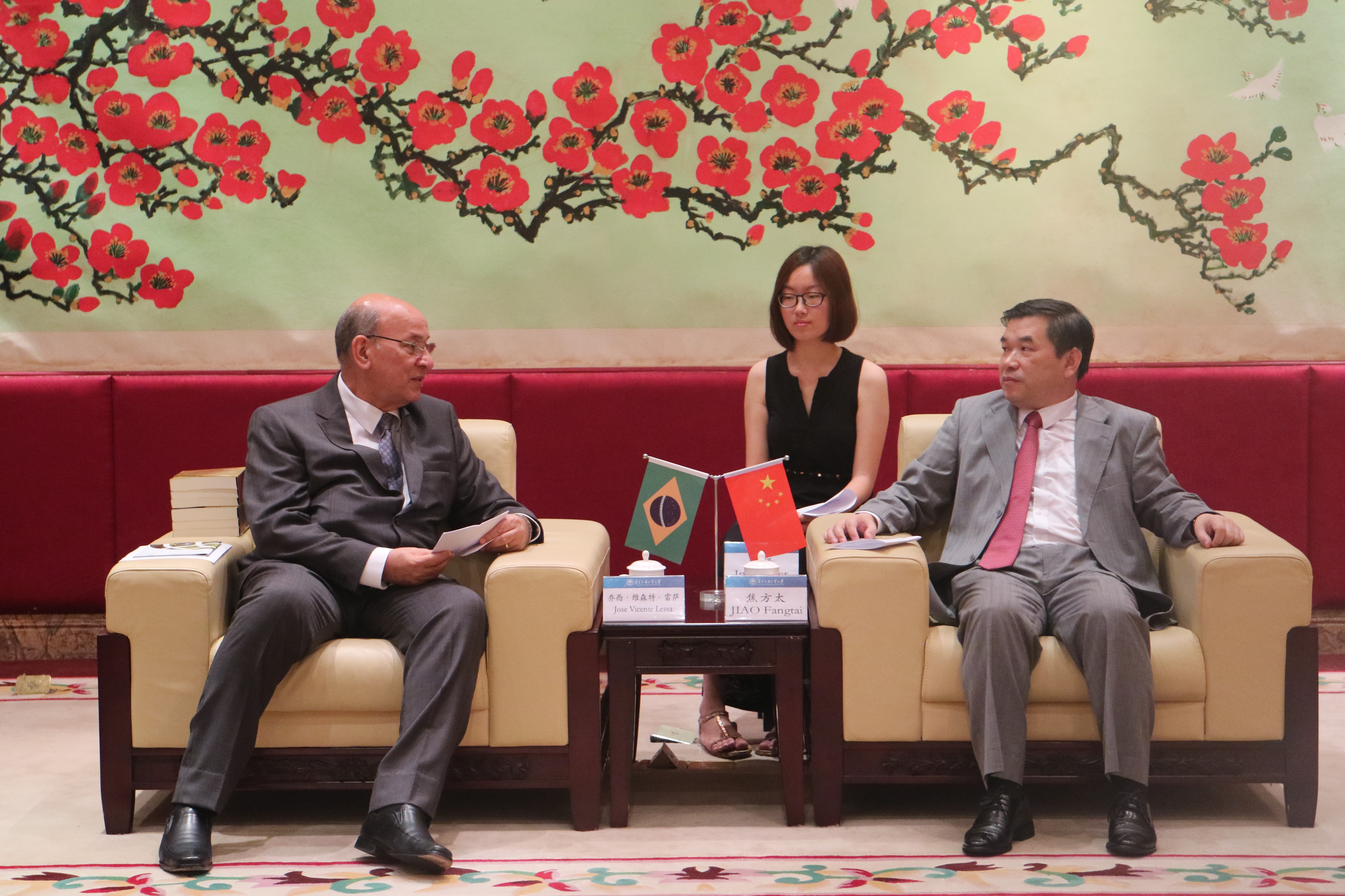 本网讯 6月15日,巴西驻穗总领事乔西·维森特·雷萨(Jose Vicente Lessa)一行来访我校并为我校图书馆捐赠图书。我校副校长焦方太在北校区行政楼贵宾厅会见来宾,陪同会见的有国际合作与交流处处长蔡红,西方语言文化学院院长杨可,图书馆馆长孔晓明等。