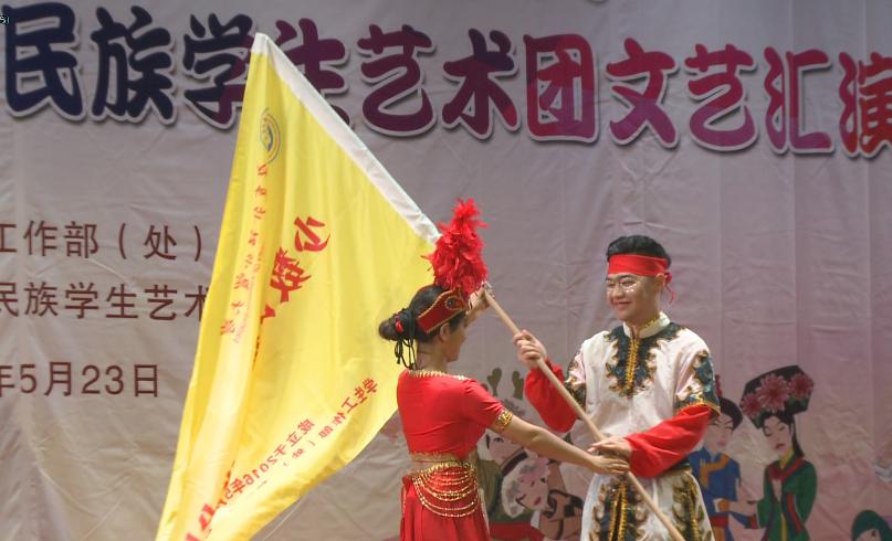 少数民族学生艺术团新任团长迪力夏提从前任团长热米莱手中接过团旗,学生工作处副处长国佳、刘军先后为少数民族学生艺术团指导老师马威威和少数民族学生艺术团2016年管理层成员颁发聘书。