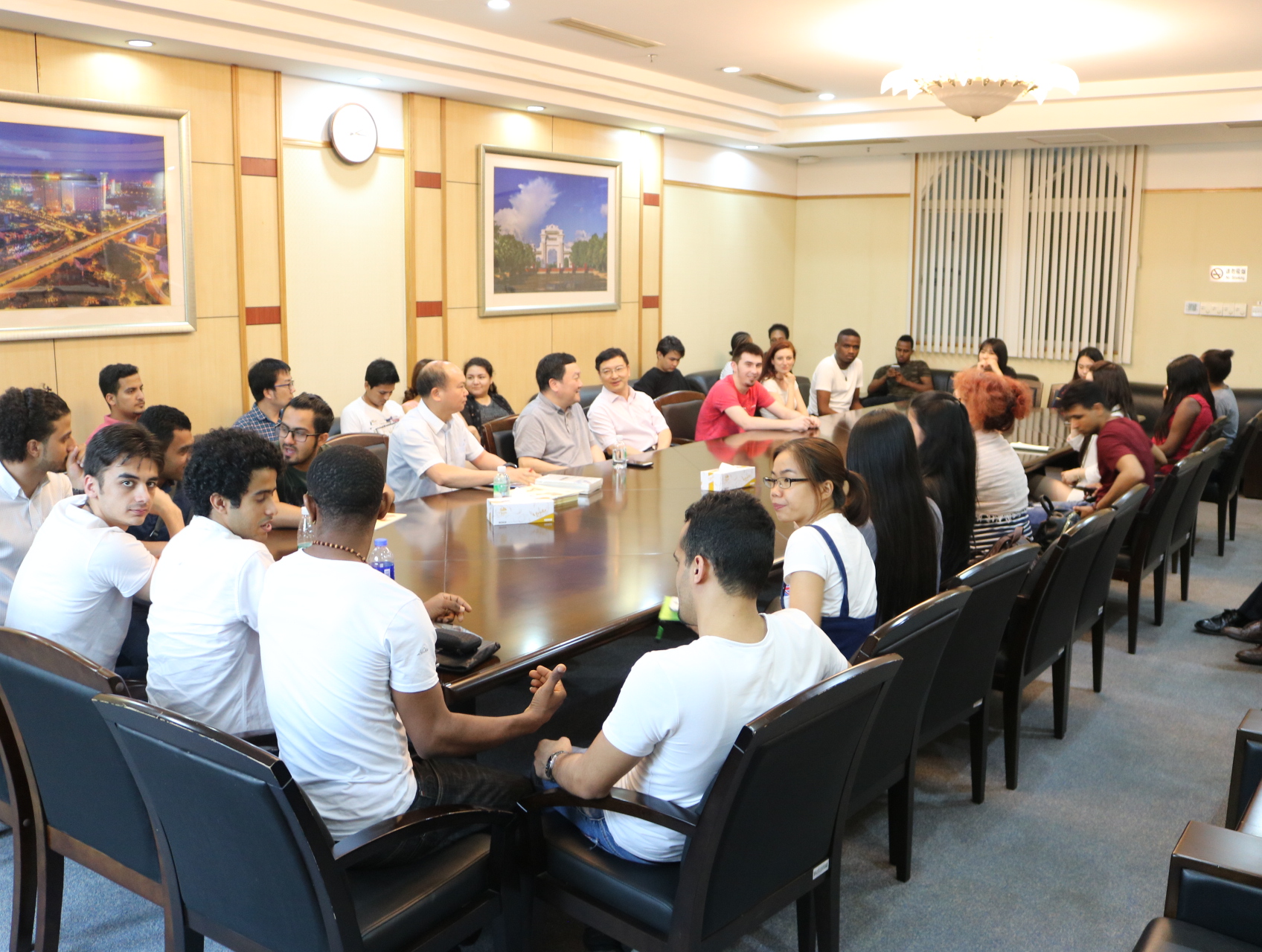 留学生院师生们前往顺德区政府进行座谈。佛山市顺德区外事侨务局局长黄建雄和副主任王文敏介绍顺德区的发展现状。在佛山市顺德区外事侨务局工作人员的陪同下,留学生参观了美的集团全球创新中心、广东省工业设计城、顺德博物馆。在龙江镇,学生们参观了联塑集团,并在座谈会上就环保、海外业务拓展等问题与集团领导进行深入交流。