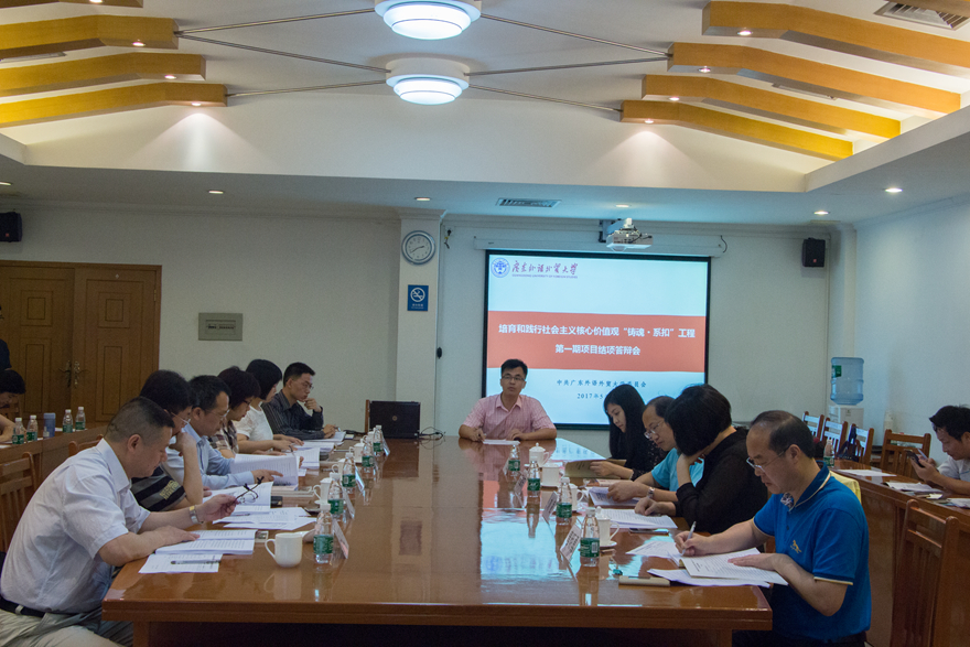 本网讯 5月24日,我校培育和践行社会主义核心价值观“铸魂·系扣”工程第一期项目结项答辩会在北校区行政楼第二会议室举行。“榜样育人”“文化育人”“实践育人”和“理论育人”4种类型的16个项目负责人对项目的实施情况和亮点特色进行了总结,广东省委宣传部宣教处处长石雄东、华南师范大学党委宣传部部长刘凌、广州大学党委宣传部部长何晓晴、仲恺农业工程学院党委宣传部部长唐明勇以及我校机关党委书记李华、发展规划处处长王则唐、党委宣传部副部长沈冬苗、马克思主义学院副院长郑亚伟等评委认真听取了项目结项报告,并给出点评和建议。