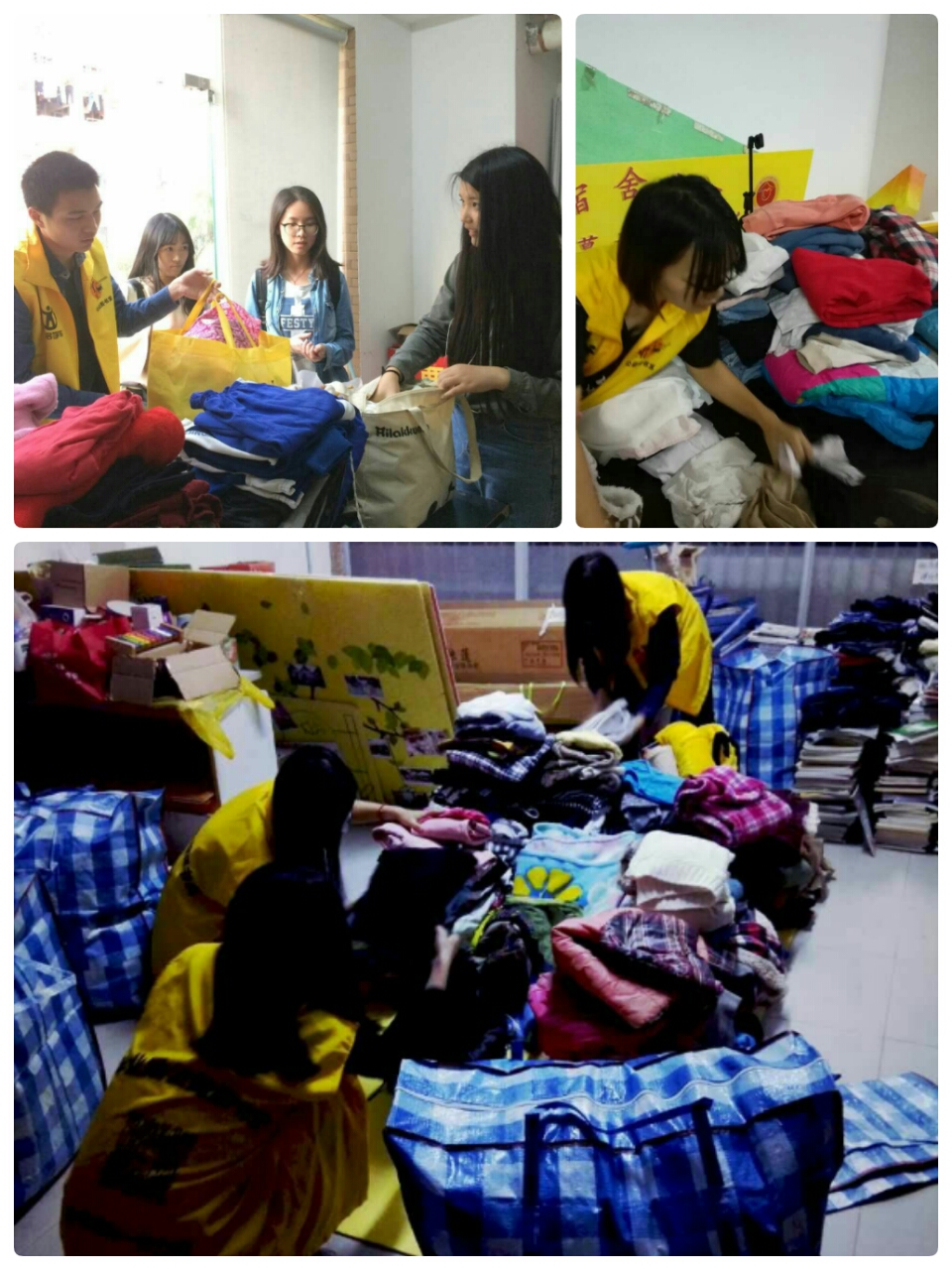 师生踊跃捐助,自强社同学整理衣物