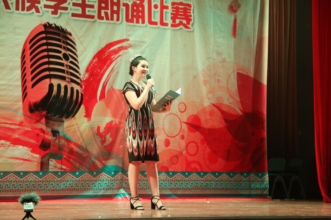 开幕式结束后,12位参赛选手相继上场一展风采。比赛采用“微访谈+朗诵”的方式,选手们的讲述满怀深情,朗诵声情并茂,比赛现场掌声不断。他们或激情澎湃地抒发理想,赞美母爱,或朴实真诚地讲述自己战胜自我超越自我的故事。他们从不同角度、不同层面,通过鲜活的内容、生动的语言,充分展示了对刻苦学习成长成才的渴望,抒发了为追求理想而不懈奋斗的决心和信心,展现了我校少数民族学生的文化素养、青春活力和精神风貌。经过激烈的角逐,新闻学院的阿力米热摘得比赛桂冠,且同时获得了最佳人气奖。