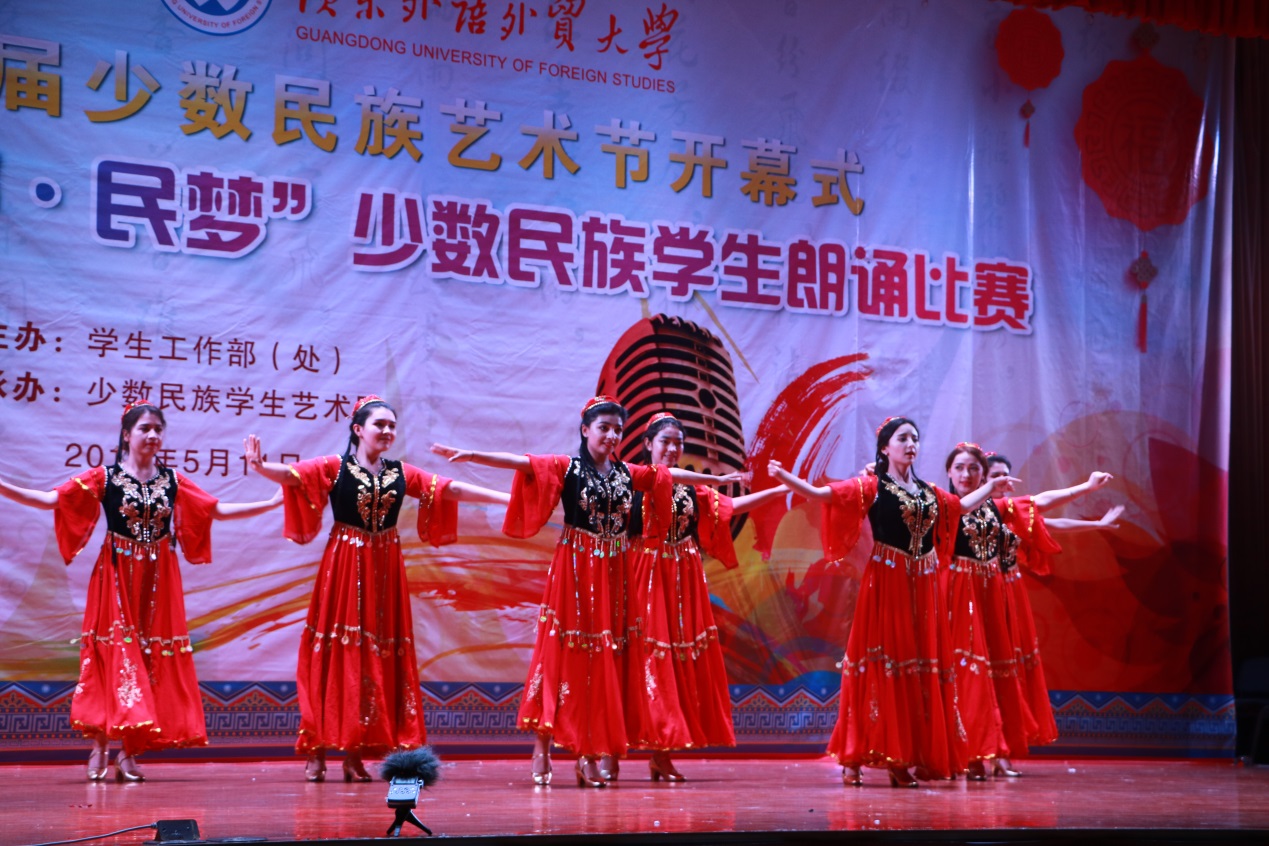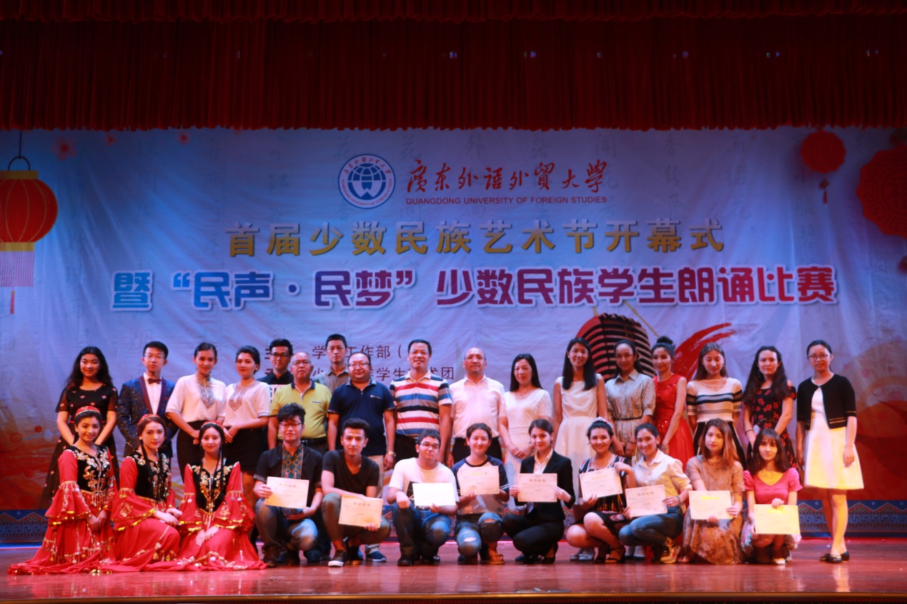 本网讯 5月11日晚,我校首届少数民族艺术节开幕式暨“民声·民梦”少数民族学生朗诵比赛于5月11日晚在南校学生活动中心举行。比赛旨在于少数民族学生艺术团成立一周年之际,向我校师生展示少数民族优秀的传统文化和风俗习惯,加强民族间的交流,促进民族团结。广东省教育厅思政处艾尼瓦尔老师,我校学生就业指导中心主任谢秀兰、学生处副处长刘军等参加本次活动。