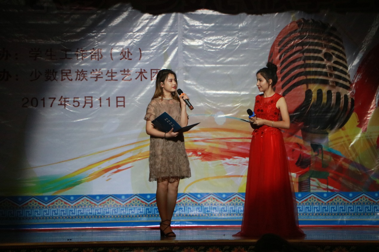 7个维族姑娘的开场舞《我从新疆来》拉开了本届少数民族艺术节开幕式的帷幕。艾尼瓦尔、刘军先后代表省教育厅和学校上台致辞,对此次活动的举办表示肯定和祝贺。