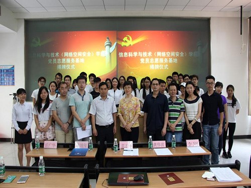 本网讯 5月11日下午,信息科学与技术(网络空间安全)学院学生党员志愿服务基地揭牌仪式在实验楼B107举行。教育技术中心党总支书记范正华、信息科学与技术学院党委副书记麦培年,教育技术中心、信息科学与技术学院相关老师以及非毕业班党员、发展对象、入党积极分子以及学生党建工作人员共130多人出席。
