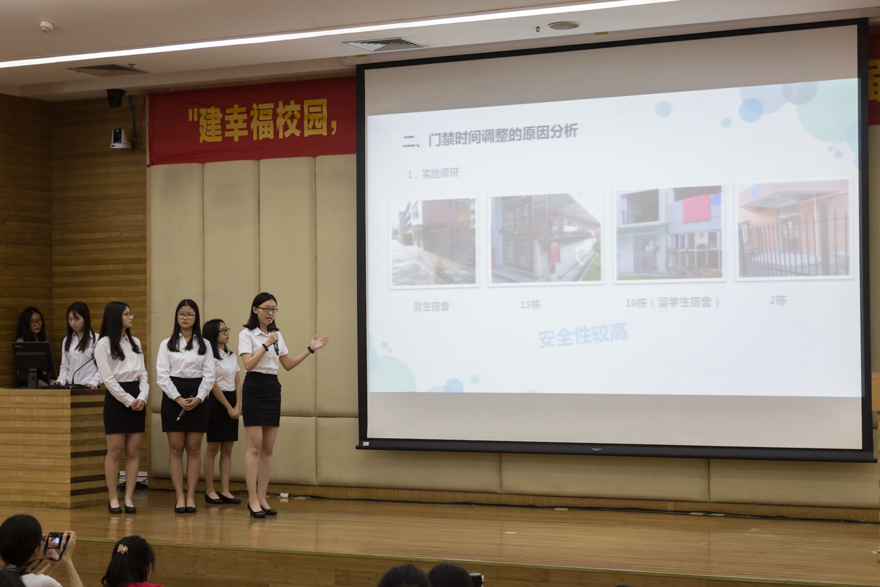 第一环节由10个团队进行提案展示并进行答辩,展示中10个队伍表现谈定,充分展示提案的创意与队伍风采,面对评委的提问,他们以开阔的思路,快速的反应,赢得了在场观众的热烈掌声和喝彩。第二环节由晋级的5个团队进行提问答辩,根据抽签顺序,一支队伍针对另一支队伍进行提问,被提问队伍做出回答。各组选手分别针对提案的内容,调研对象,具体的操作措施等问题对选手发问。双方选手激烈的交锋,每个项目之间的实力角逐,令现场观众拍手称赞。
