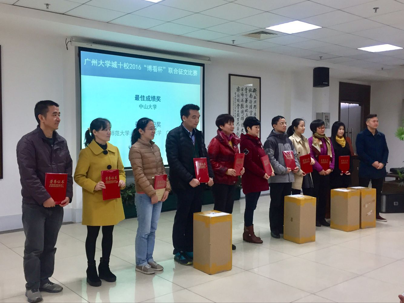 本网讯 12月28日上午,广州大学城十校图书馆资源共建共享工作会议在中山大学召开。会议表彰第一届“中科杯”广州大学城十校掌上知识竞赛、广州大学城十校 2016“博看杯”联合征文比赛中获奖的单位和个人,我校周清获得知识竞赛一等奖,邓咏琛获得征文比赛活动二等奖。学校图书馆获得两项赛事的“最佳参与奖”。